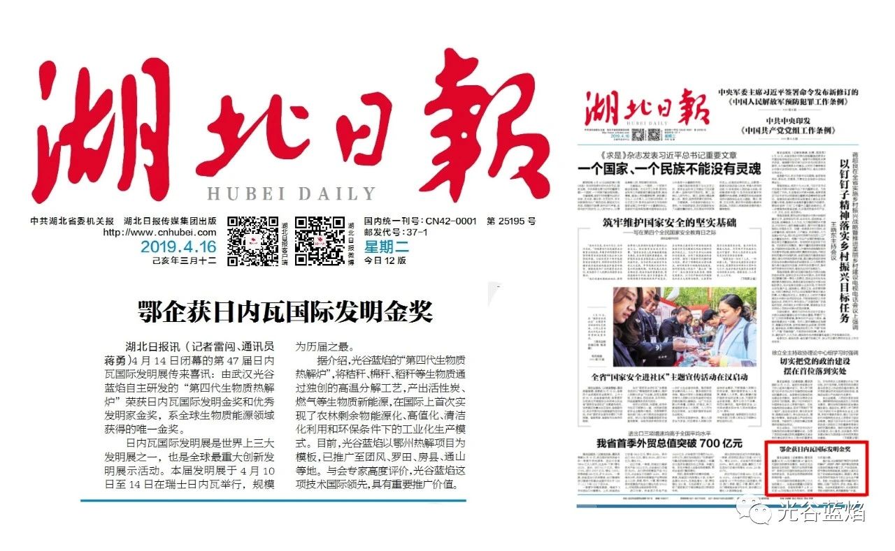 《藍(lán)焰視線》報道:2020年4月,湖北省科技廳、荊楚網(wǎng)主辦“2019湖北省十大科技事件征集”活動,武漢光谷藍(lán)焰自主研發(fā)的“第四代生物質(zhì)熱解爐”榮獲第47屆日內(nèi)瓦國際發(fā)明金獎和優(yōu)秀發(fā)明家金獎,作為重要科技成果進(jìn)入候選名單。參與候選的共20件在全國全省具有重要影響的科技事件。